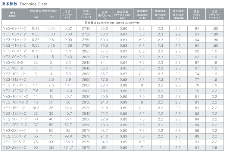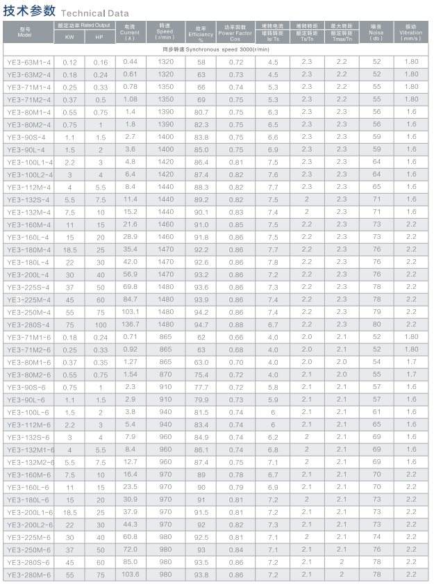 YE3 serice electric motor is the improvement type of Y series,all the performances are in conformity with IEC standard.it has the advantages such as perfect structure,attractive appcarancejlttle vlbratlonjow noise,heat resistance and high protection class.It reaches the international advanced level.